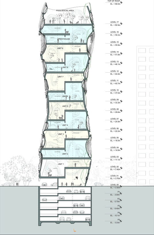 Estos renders y planos corresponden a un proyecto de arquitectura orgánica para viviendas plurifamiliares en la ciudad de Lima (Perú). Es la Condo Tower, un edificio con una superficie de 5.000m2 para un condominio de lujo. Tiene un total de 9 apartamentos, un ático, y una terraza superior para uso de toda la comunidad. En total son 17 niveles (+ 4 plantas de sótano), y tiene una altura de 69 metros.