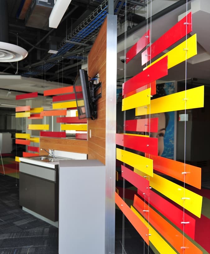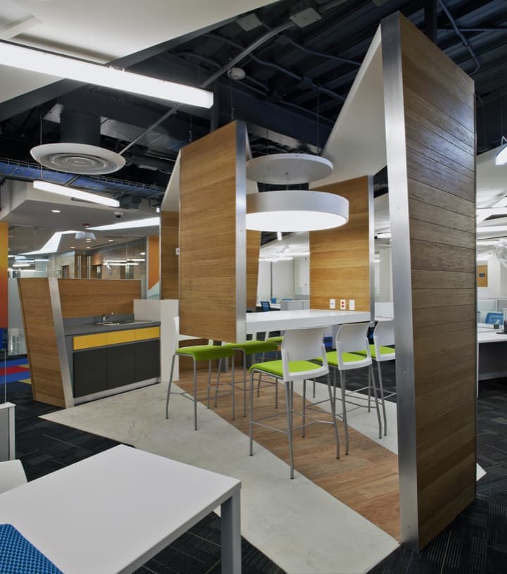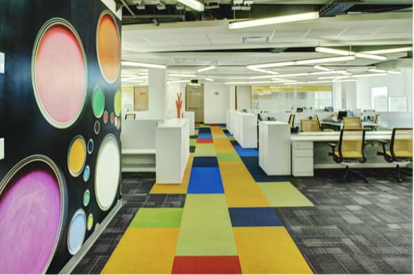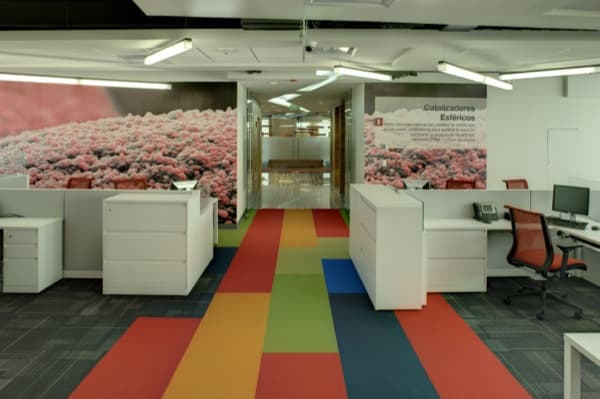 Las zonas de trabajo están separadas entre sí por un sistema de mamparas de poca altura. Adquiere un importante impacto el colorido que se ha añadido a algunas partes del suelo, paredes. Lo mismo ocurre con la geometría con la que se ha organizado la iluminación en los techos. Estas estrategias pretenden crear una decoración de interiores que aporte un agradable y moderno ambiente de trabajo.