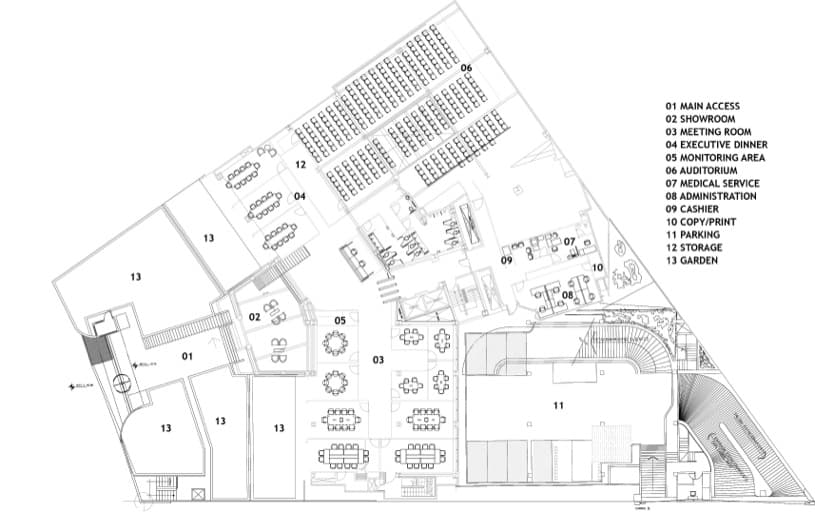 La planta baja está destinada a la recepción (con área de espera y puntos de acceso). Hay un espacio showroom para la exhibición de algunos productos de la compañía. Aquí se incluye pantallas de proyección. Por supuesto la presencia del logotipo corporativo adquiere un gran protagonismo (situado sobre un muro). Hay un espacio público con salas de juntas, de las cuales dos de ellas cuentan con un muro móvil, con la idea de darle mayor flexibilidad de uso. Estas salas disponen de equipos audiovisuales y diferentes tipologías de pantallas. El comedor tiene capacidad para 100 comensales (en dos turnos) pero su uso es mixto, ya que puede también funcionar como auditorio. En esta misma planta se han alojado además los servicios médicos, cuarto de lactancia, cajero, y zona administrativa.