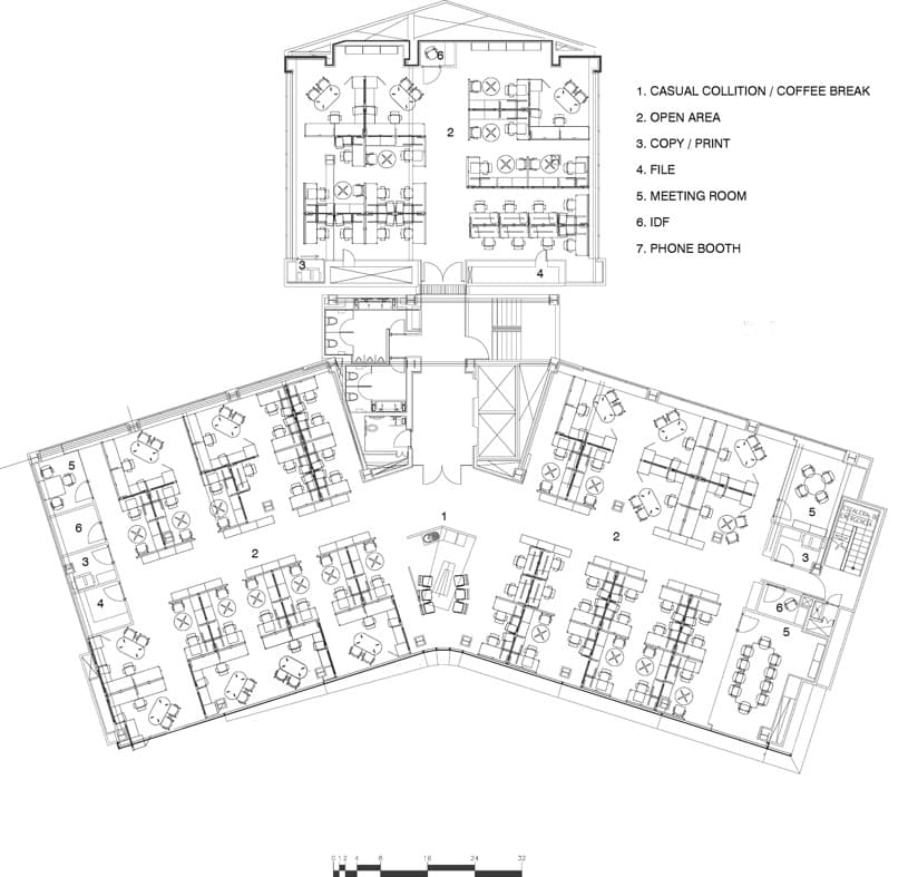 Las plantas tipo (de la 2ª a la 6ª) son principalmente espacios diáfanos de trabajo, excepto el último piso, que está destinado a la presidencia y por eso cuenta con despachos privados. La distribución de funciones está reflejada perfectamente en el plano de planta, aunque es difícil encontrar la ubicación exacta de los ‘phone boots‘. Son una especie de cabinas para la comunicación privada de los empleados. Hay también pequeñas salas de juntas, y una interesante zona para el descanso (casual colisión) con servicio de café y espacio para reuniones informales. Pero en cada piso este área se ha diseñado de diferente manera, siendo tal vez la parte más divertida del proyecto.