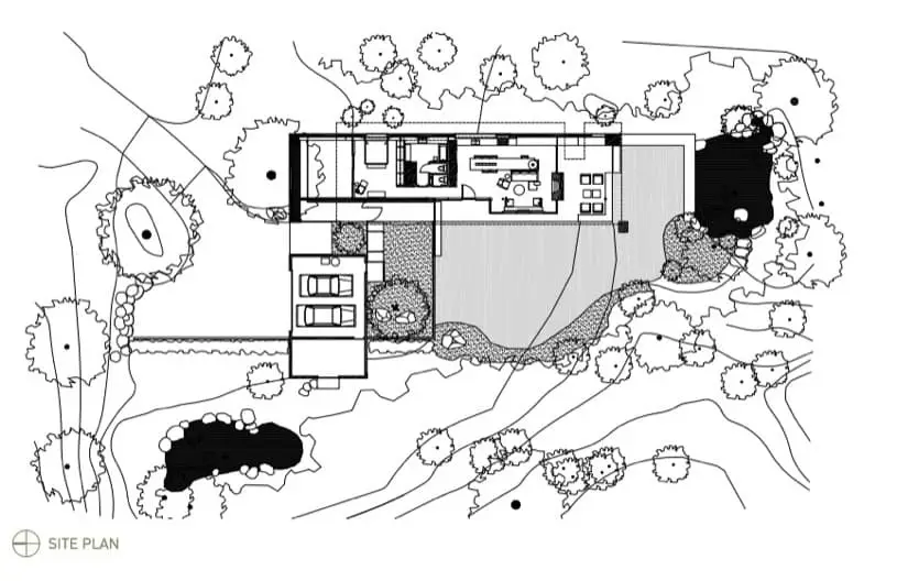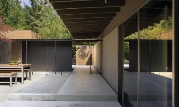 La cubierta se apoya en el muro que hay en el lado este de la casa. El lado opuesto es muy acristalado, para ofrecer vistas a la vegetación del jardín y a unos estanques de agua. Pero la vivienda se extiende más allá de los cerramientos de vidrio. Lo hace gracias a los voladizos del tejado, al patio junto al dormitorio y, por supuesto, al porche situado en el sur.