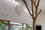 Los árboles fueron cortados con las ramas intactas, y luego sometidos a un proceso de secado (por ahumado) que duró dos semanas. Después se colocaron de nuevo en la parcela, en el lugar original (al menos uno de ellos), pero incorporándolos a la estructura de la casa para que funcionaran como auténticos pilares. La foto adjunta (más abajo) describe estupendamente cómo están integrados en la obra, soportando el forjado de madera superior, y quedando por tanto visibles en el salón y cocina de la vivienda. El resultado final es bastante sorprendente: los dos árboles ocupan por completo la doble altura de la sala principal, en un lenguaje perfecto con el suelo y demás elementos de madera de la casa.