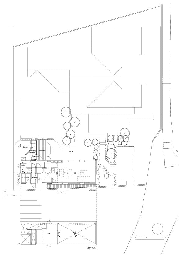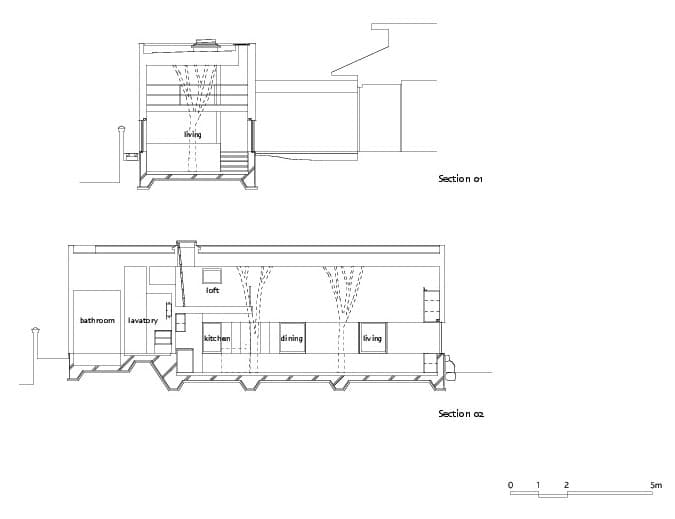 Como se puede ver en los planos de planta y sección, el programa de esta vivienda es bastante sencillo, pues casi todo el espacio se ha destinado a la sala (con la cocina y comedor integrados), colocando el dormitorio en un altillo justo encima de la cocina. La nueva construcción está comunicada con la antigua casa mediante un pasillo en forma de «S». Eso sí, jamás se nos hubiera ocurrido utilizar la rama de un árbol como soporte para la lámpara, por lo mal que queda el cable blanco enrollado en ella.