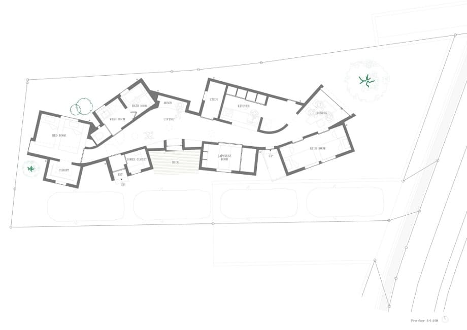 El autor de este proyecto es el mismo de la fantástica (y estrecha) casa de 3.94m, el arquitecto Shintaro Fujiwara. En esta ocasión las limitaciones no son tan fuertes, pero también se trata de una parcela alargada (263m2). En ella se construye una vivienda de una única planta para una familia con dos hijos. Está ubicada en Sayo (prefectura de Hyogo, Japón), y cuenta con una superficie construida de 83m2. Viene a suponer otro de esos proyectos de ‘casas experimentales‘ típicos de la arquitectura de aquel país.