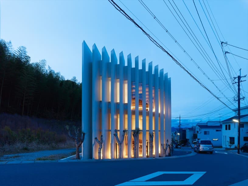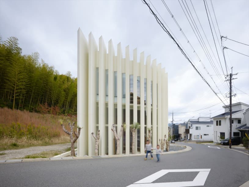 Esta vivienda para una familia con dos hijos tiene una superficie de 100m2, está construida en una parcela con forma de abanico, en los límites de una zona residencial de Muko (Kioto, Japón), y lindando con una carretera. Aunque el proyecto tiene su interés por la distribución de espacios, la parte más singular la encontramos en la fachada principal. Funciona como una gran persiana que filtra la luz del sol. Cada uno de los elementos que la componen tienen una profundidad superior al metro, de tal manera que provocan la reflexión de la luz en las horas de la mañana y la tarde, inundando el interior de la casa con una luz difusa.