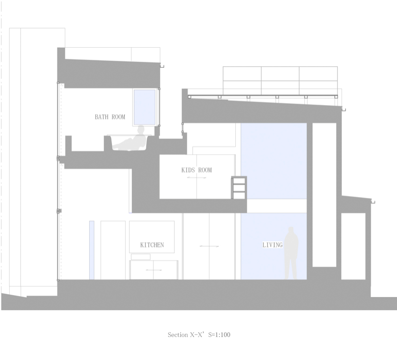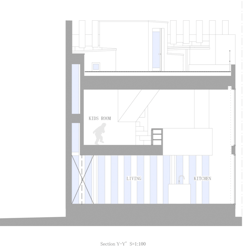 La planta baja está organizada en un espacio compartido por la cocina, comedor, y sala de estar, mientras que el dormitorio principal queda oculto tras unas puertas correderas. La habitación de los hijos queda arriba, al igual que el cuarto de baño, pero en diferentes niveles. En los planos de planta y sección se puede apreciar la disposición escalonada de cada uno de los forjados que forman la estructura de esta casa, y los espacios vacíos que dejan, provocando una mayor altura libre en la sala.