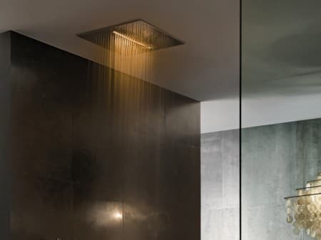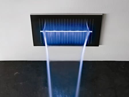 Acqua Zone es una ducha con función de lluvia a la que se le han añadido capacidades de cromoterapia. Su uso hace que la luz y el agua envuelvan al cuerpo, según nuestras emociones, ofreciendo un placer sofisticado en el cuarto de baño. Esta moderna ducha está compuesta por una parte empotrada en el techo, de acero inoxidable y con fijación para carga pesada, y una parte externa formada por un panel con 400 orificios que proporcionan una lluvia. Completa este diseño una salida de agua en cascada de 400mm.