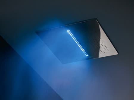 El acabado está disponible en acero natural brillante, o en acero cepillado. El plafón de Acqua Zone mide 53 x 53cm.