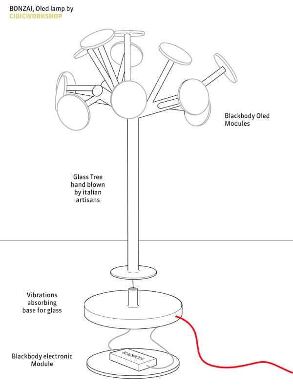 Combinando tecnología OLED puntera en iluminación, y el trabajo artesanal en vidrio soplado a mano, se creó BONZAI. Es un diseño que permite componer lámparas de mesa que se asemejan conceptualmente a los bonsáis.