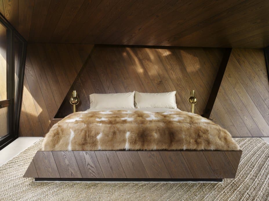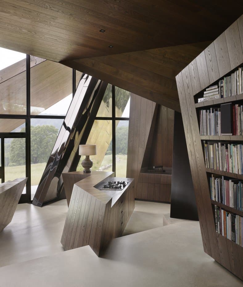 Afortunadamente, esta volumetría tan quebrada también se ha trasladado al interior de la casa. Es todo un espectáculo arquitectónico con espacios delimitados por techos y paredes inclinadas. Leves cambios de nivel en el piso de hormigón distinguen la cocina, comedor, sala, y dormitorio. La organización es bastante abierta, pues tan solo encontraremos puertas para acceder al inodoro y al dormitorio; pero también inspira un ambiente acogedor, ya que se ha utilizado la madera para revestirlo todo por dentro. El diseño personalizado de prácticamente todos los elementos de la casa (lavabo, grifos, muebles…) hace que entendamos esta vivienda como una obra maestra de la arquitectura contemporánea.