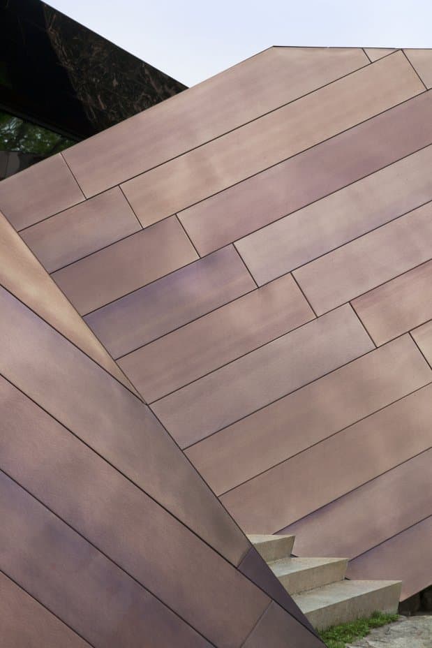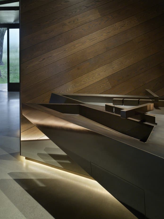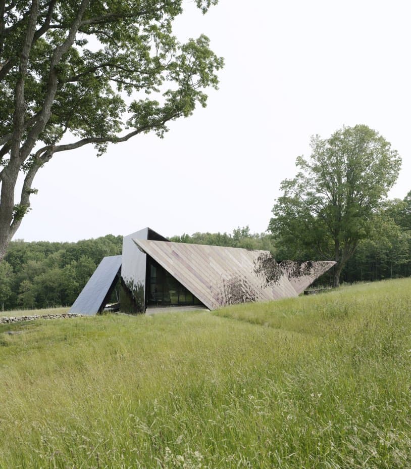 El extraño nombre de Casa 18.36.54 deriva de los 18 planos, 36 vértices, y 54 aristas que definen su volumen. Se trata de una construcción de 185m2 situada en una finca de casi 22 hectáreas, al oeste de Connecticut (EE.UU.). El revestimiento exterior de paneles de acero inoxidable color bronce, con acabo espejo, hacen que esta vivienda se vea cada vez de una manera diferente. Este acabado refleja el paisaje circundante. Llega incluso a potenciar los cambios ambientales provocados durante las estaciones, o en un mismo día.