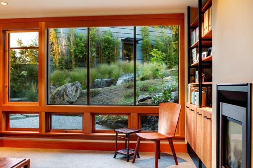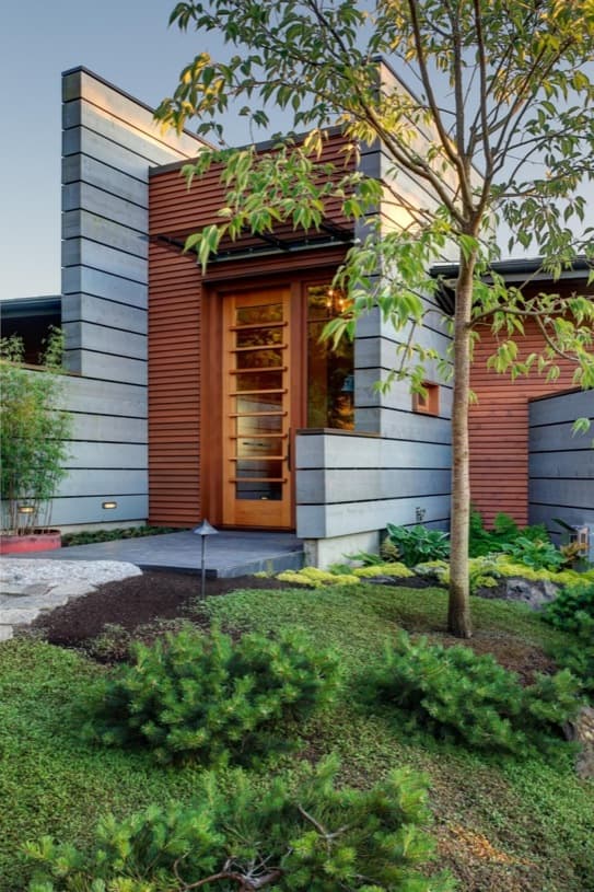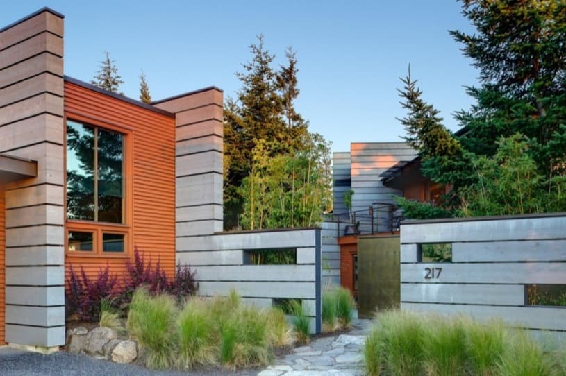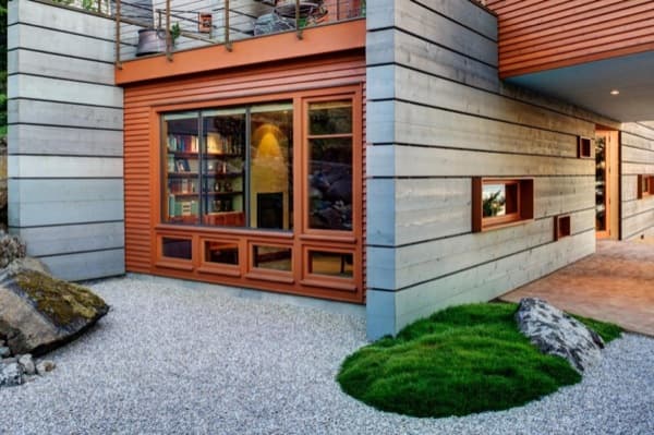 Hay que destacar de este proyecto el acabado exterior en color gris, con una textura que marca la horizontalidad, y el revestimiento de madera (en su color natural). También nos ha gustado mucho el jardín que queda junto al camino de acceso a la entrada de la casa (ver foto superior). Y por supuesto toda la decoración interior.