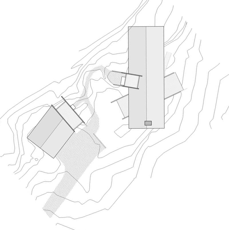 Esta vivienda tiene dos pisos, siendo accesible por cada uno de ellos. Está formada por un volumen principal que tiene cubierta a dos aguas, el cual es ‘atravesado’ por otro que organiza las estancias del nivel inferior. Este segundo volumen ofrece en su azotea dos grandes terrazas panorámicas. El tercer espacio al aire libre está vinculado a las actividades de ocio de la planta inferior, y dispone de una chimenea.