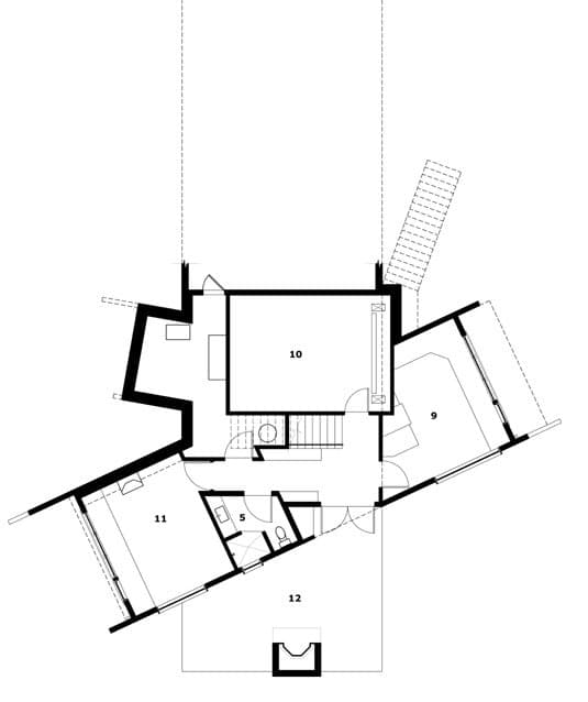 La puerta principal de acceso se realiza por la planta superior. Se hace mediante un pequeño volumen saliente que no es perpendicular a la estructura principal de la casa. Una vez dentro, nos encontraremos con un gran espacio destinado a salón (con otra chimenea que comparte el tiro vertical de la anterior), el comedor, la escalera de bajada al piso inferior, y la cocina. Adosada a esta última se encuentra una despensa y un aseo. La parte posterior de esta hermosa vivienda está ocupada por el dormitorio, del que no podemos perdernos el cuarto de baño, con una gran bañera en un rincón panorámico. También hay un ropero, conectado a una pequeña sala con un lavabo.