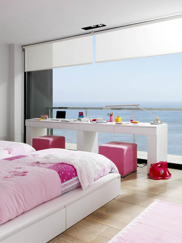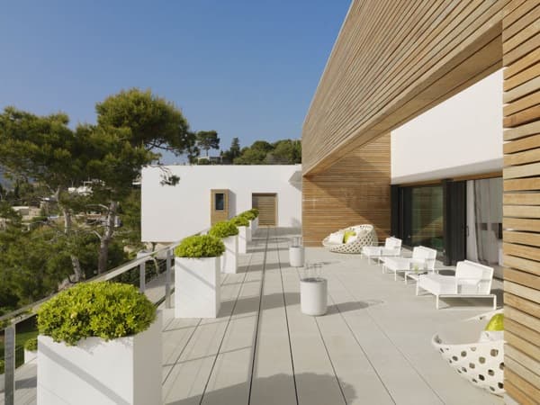 Las únicas partes decoradas añadiendo otros colores fueron la zona de los hijos (incluida la sala de juegos), y el cuarto de invitados. Aparte del interés que tiene esta casa por su decoración, también destaca por el estilo de su magnífica terraza, donde la madera toma cierto protagonismo.