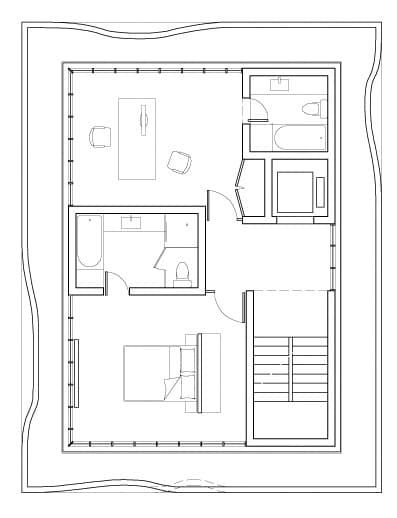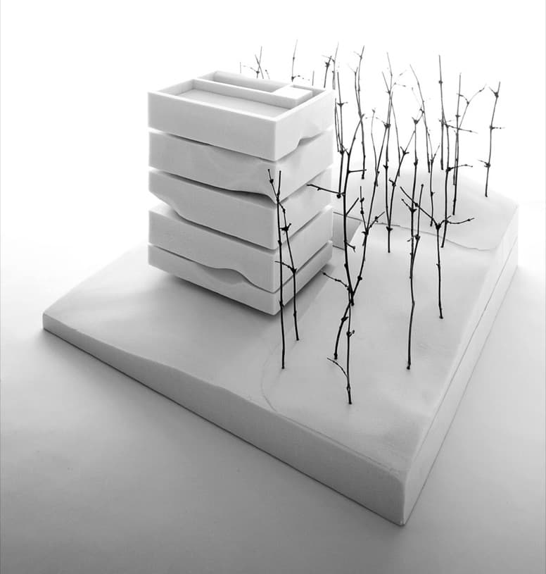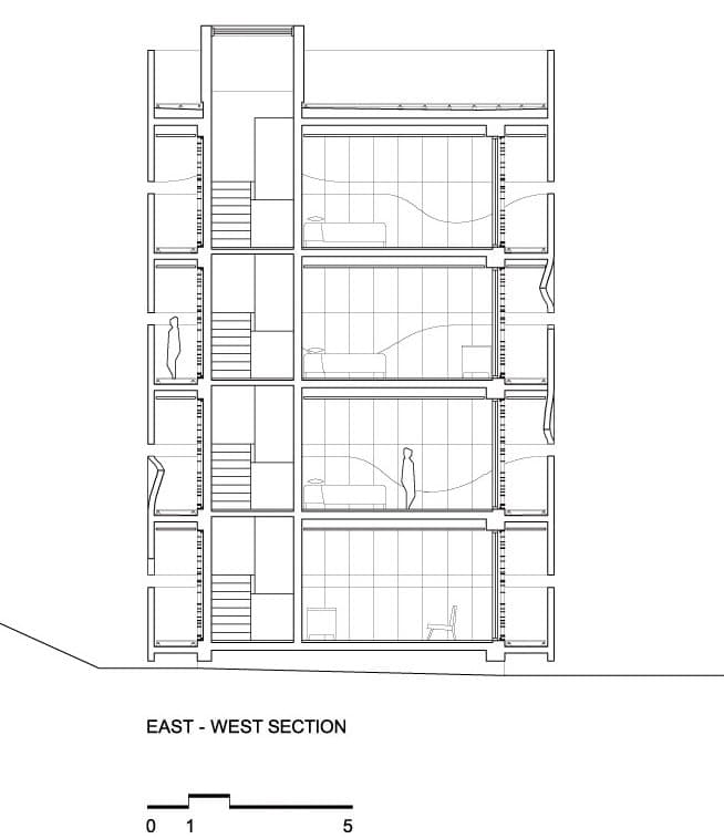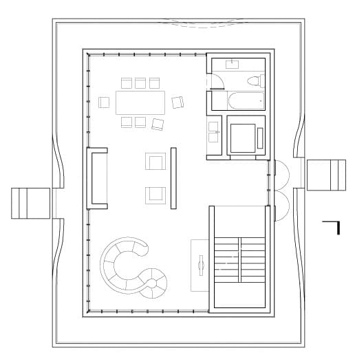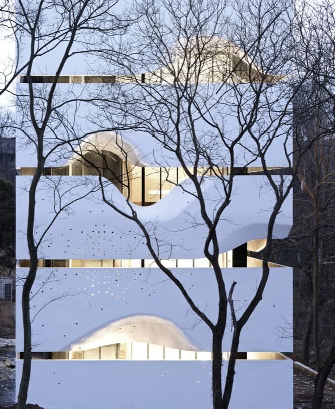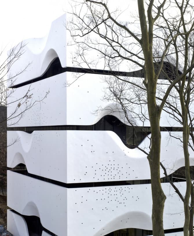 El edificio tiene una volumetría bastante rotunda, pues se trata de un prisma de cuatro plantas con el aspecto de un gigantesco mueble blanco perdido en el paisaje. En realidad, lo que observamos desde el exterior es una terraza perimetral por cada planta. Pero se deja una estrecha franja horizontal con la siguiente. Este hueco está alterado por unas deformaciones curvas, y multitud de pequeñas perforaciones aleatorias. De esa manera, dicha geometría funciona como una segunda piel que aporta más protección a la vivienda.
