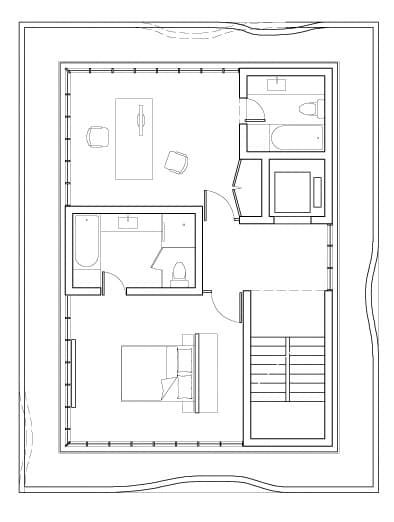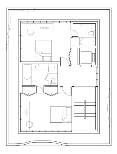 En el interior de la casa se distribuye un programa que tiene un espacio diáfano en planta baja. Funciona como salón, cocina y comedor. En una de las esquinas se sitúa el cuarto de baño y el ascensor, mientras que en la otra está el hueco de la escalera. En las plantas superiores hay dos habitaciones en cada una de ellas, ambas con cuarto de baño propio. La azotea está preparada con una piscina y un jacuzzi, y revestida con tableros de madera.