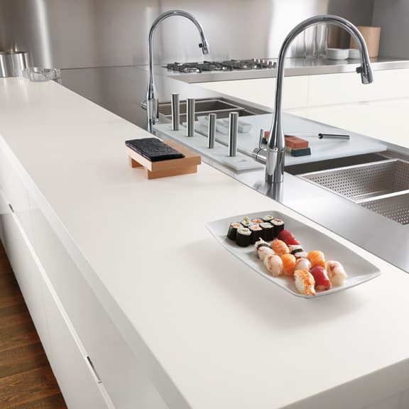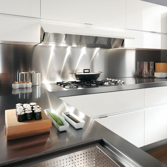 Hemos seleccionados fotos de muebles en los que se ha combinado el acero inoxidable con material Corian. Pero hay versiones en las que se ha optado por el mármol y el nogal también. En ninguno de ellos existen puertas con tiradores. Hay disponibles 29 colores diferentes, siete variantes para la encimera, y numerosas posibilidades de campanas extractoras, tanto si van en pared o en isla.