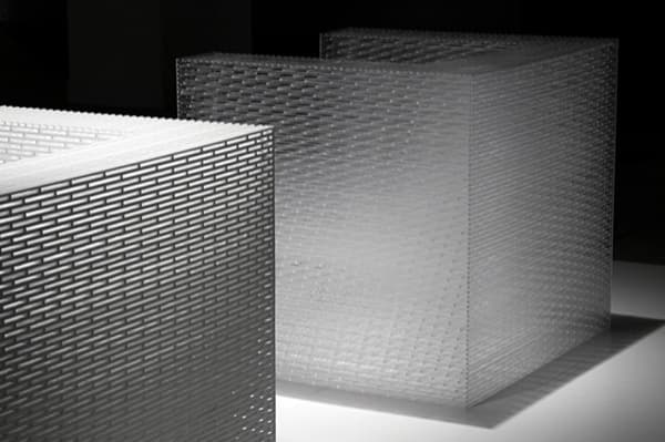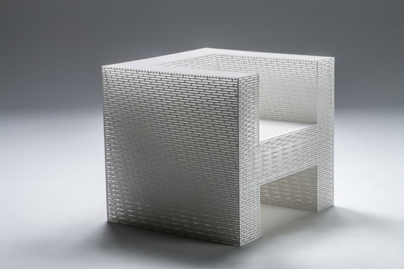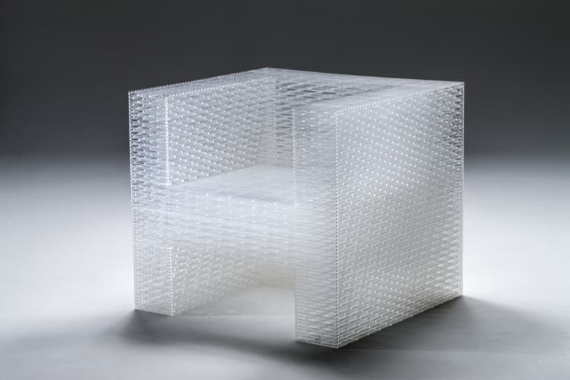 Los sillones de la colección 2450 están realizados con varillas de material acrílico de 5mm, unidas para crear una estructura bastante arquitectónica y etérea a la vez. Este mueble tiene un aspecto bastante delicado y frágil, que parece va a romperse nada más utilizarse. Está compuesto por 2.450 piezas meticulosamente enlazadas, pero que si las alineáramos alcanzarían la longitud de casi un kilómetro.