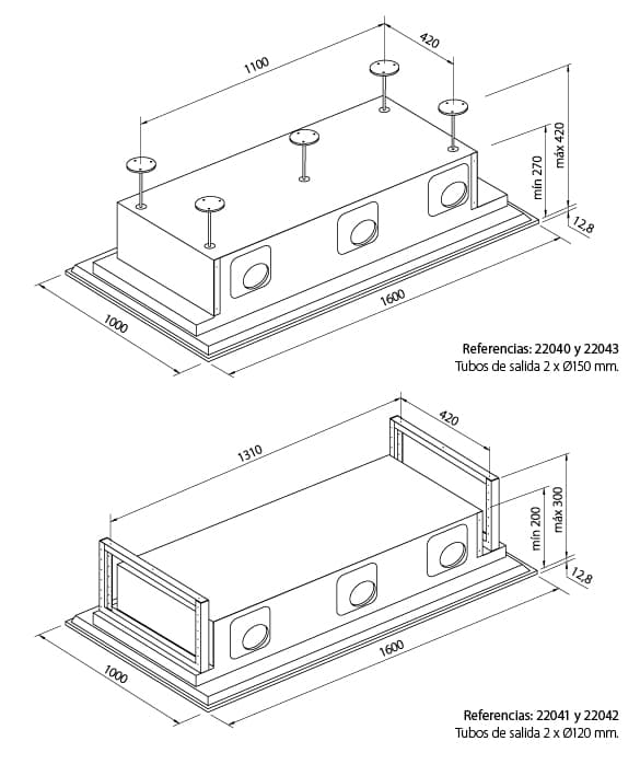 - Inart 4M. Viene con 4 superficies extractoras alineadas, tiene unas dimensiones de 2.000 x 1.000mm, y trae 8 filtros. En este diseño la iluminación está proporcionada por 10 LEDs. Según el motor, se pueden alcanzar potencias de 2.400m3 o de .3440m3.
