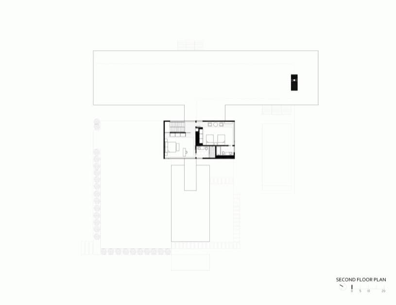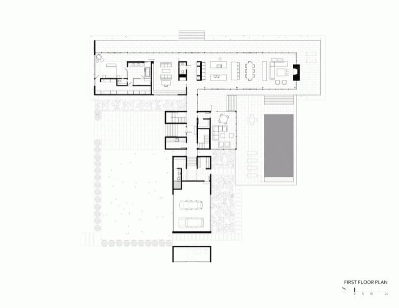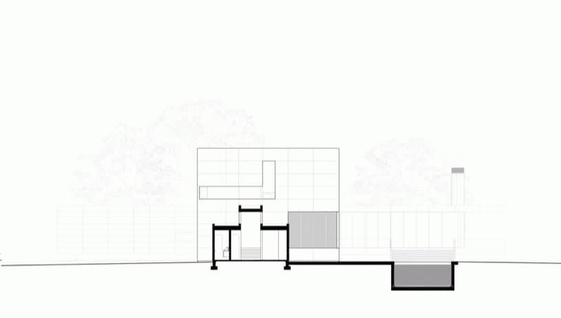 Aunque se trate de una vivienda de dos plantas, es una construcción donde predomina la horizontalidad, organizada en tres pabellones conectados por galerías acristaladas. El volumen central es el que marca la entrada. Este edificio cuenta con el programa de una pequeña casa, pues deja en el nivel inferior una sala de estar, cocina, y espacio de almacenamiento. En la planta superior se sitúan dos suites. Un amplio garaje está en el volumen que queda al oeste, con un pequeño taller y un aseo.