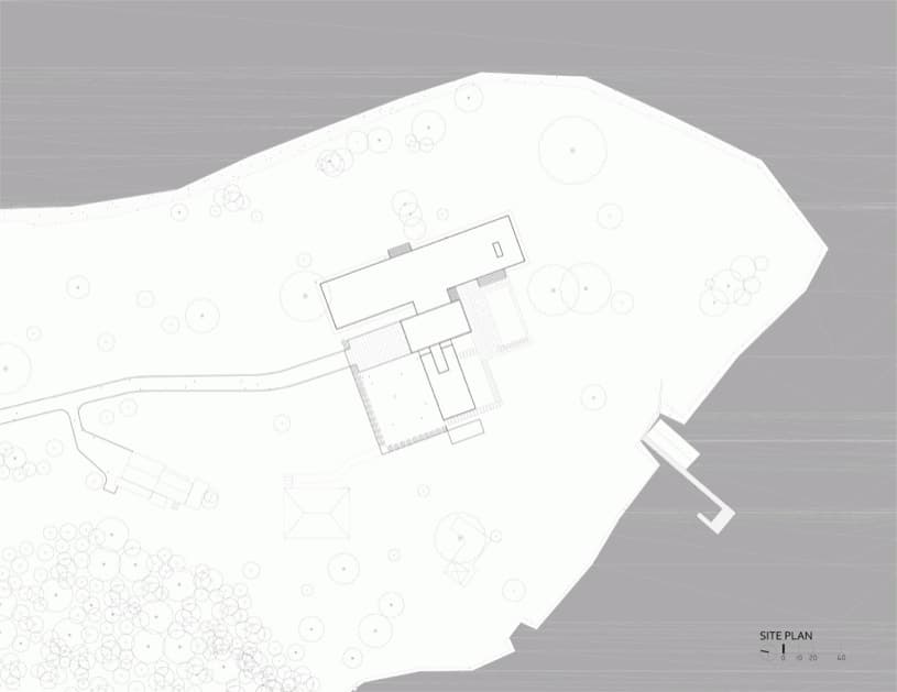 La pieza noble de la Casa Tred Avon la forma el pabellón que está orientado al este. Es fundamentalmente un espacio despejado que contiene la cocina, comedor, y varias salas, una de ellas en el extremo que preside la chimenea. En el lado opuesto está el dormitorio principal, que también tiene carácter de suite, pero en esta ocasión con un cuarto de baño más amplio, y con vestidor. Precisamente el ropero es el único punto de este volumen que tiene una fachada opaca. El resto está completamente acristalado y vinculado a una terraza perimetral.