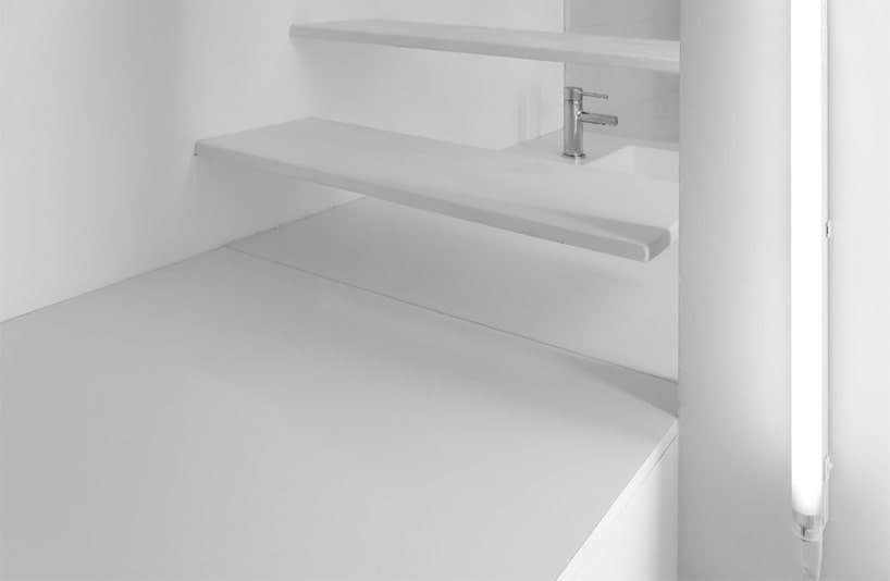 Por razones obvias, el inodoro se ha ubicado en un pequeño espacio independiente, justo en la entrada de la casa. El resto está completamente diáfano, pintado en un color blanco neutral, donde la decoración es «no decoración». Se ha reducido cada elemento a su mínima expresión, a un minimalismo extremo. Encontramos que el dormitorio está sobre una losa que forma un altillo, y justo debajo el lavabo y la ducha. A un lado de la pared-frontera, la luz es de un IRC cercano a cero (no es muy importante la cualidad cromática en el baño). Se consigue con unas lámparas de sodio de baja presión. Para el resto se han utilizado varios tubos fluorescentes (de alto IRC).