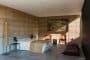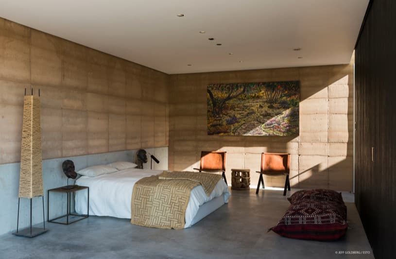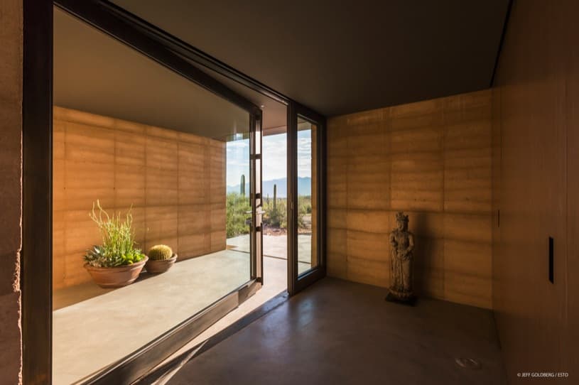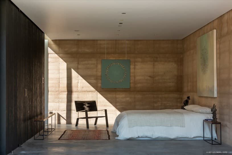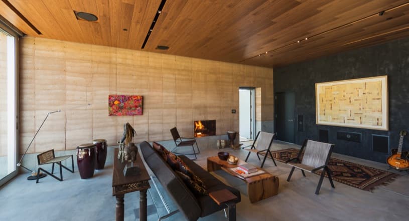 Para que el conjunto se viera camuflado en el paisaje, se optó por una estructura basada en muros de tierra apisonada. Esto proporciona una textura muy peculiar y un color de lo más natural, tanto al exterior como al interior de la casa, ya que sobre ellos no se ha aplicado ningún acabado posterior. Además, este material aporta ciertas características sostenibles al edificio, al tiempo que una buena masa térmica.