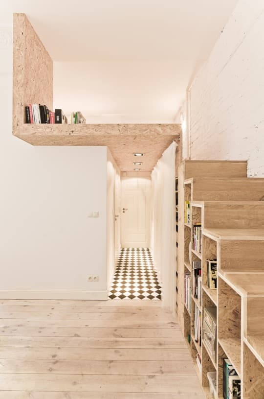 Este proyecto surgió a partir de la reforma de un apartamento situado en un edificio del sigloXIX, en Breslavia (Polonia). Los 29 metros cuadrados de su superficie no daban para mucho, pero la altura libre de 3.7 metros ayudó bastante. Permitió poner la cama en un altillo (loft), justo encima del baño y armario que hay en la entrada a la vivienda.