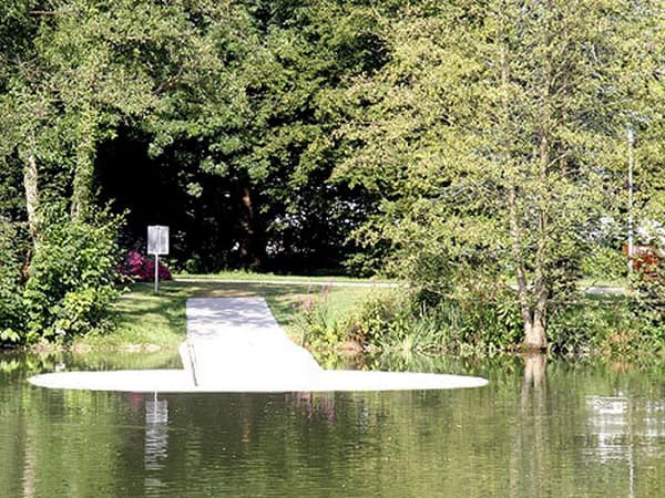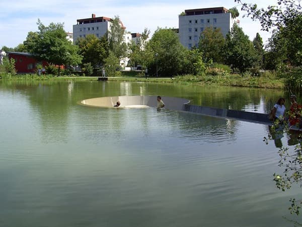 Está claro que diseñar una estructura de hormigón para crear un vacío en un estanque de agua, responde perfectamente a ese significado. Descender desde ese parque de Vöcklabruck (Austria) a través de una rampa, llegar a ese espacio circular completamente rodeado de agua, y mantener la vista a ras del nivel del agua, debe ser toda una experiencia para el visitante.