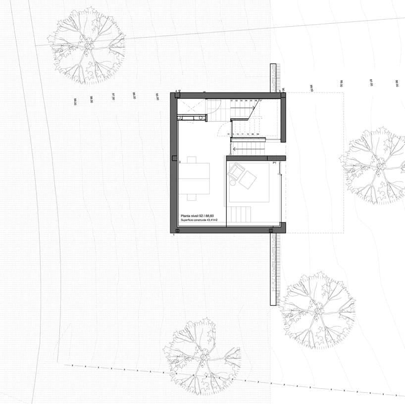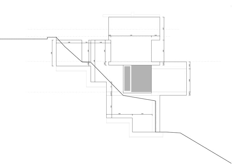 El edificio está resuelto con una sucesión de terrazas, donde cada una de ellas funciona como pórtico de la planta inferior. Esto hace que aparezcan diferentes voladizos que se asoman al bosque de pinos y a la costa. También crea una buena conexión entre el interior y el exterior de la casa.