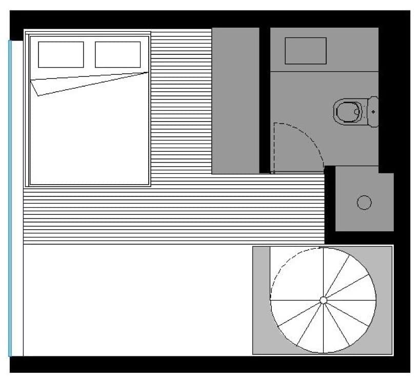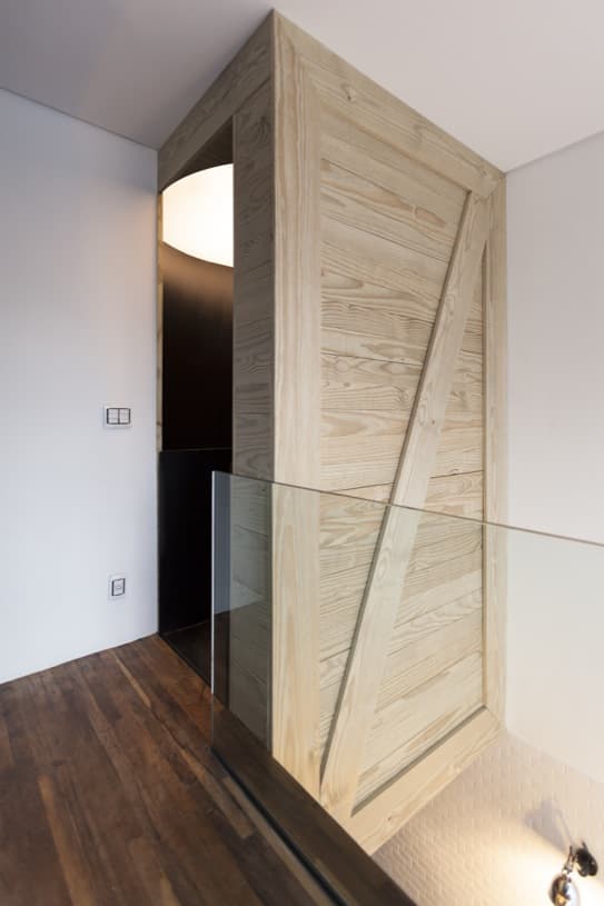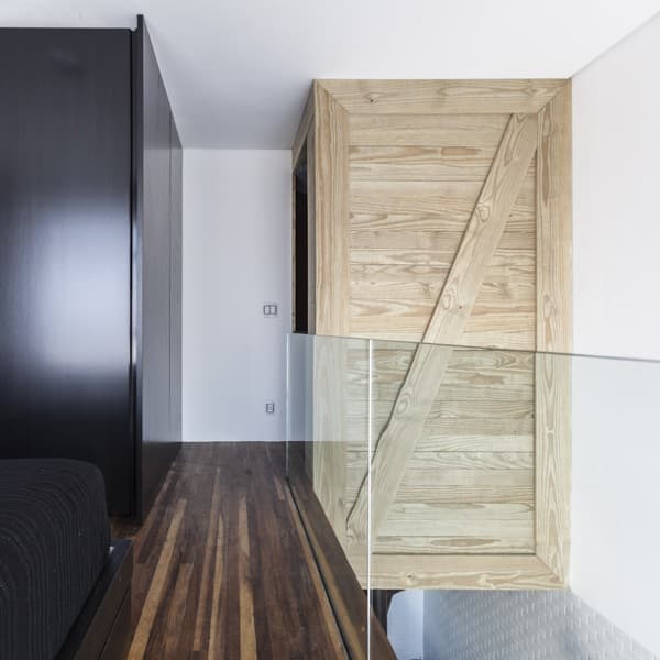Esta disposición nos invita a cuestionar algunas de la decisiones tomadas en dicha reforma, ya que resulta extraño que no se haya aprovechado todo el espacio de la planta superior y así tener sitio para una zona de escritorio, por ejemplo. En su lugar se ha dejado un hueco de doble altura, pero con un cambio de textura en la pared, provocando un desequilibrio en la decoración. El color negro de la pared de la cama (cabecero), el armario del dormitorio, y sobre todo la lámina que envuelve la escalera, es más apropiado para viviendas donde no escasea la superficie. Y por último, el hecho de revestir el techo del salón con la misma madera que el piso del dormitorio, provoca un efecto agobiante, que además choca con la textura de los muebles-caja, que es completamente diferente.
