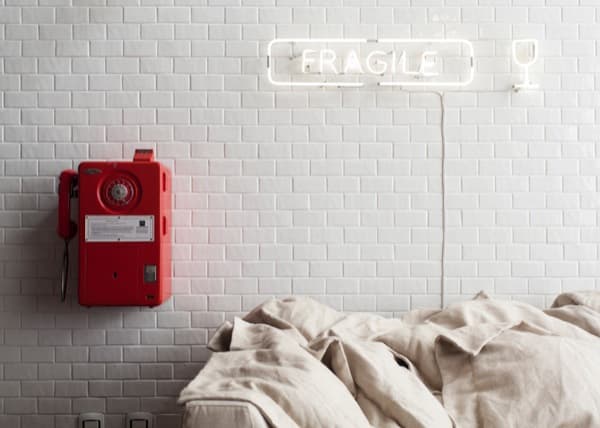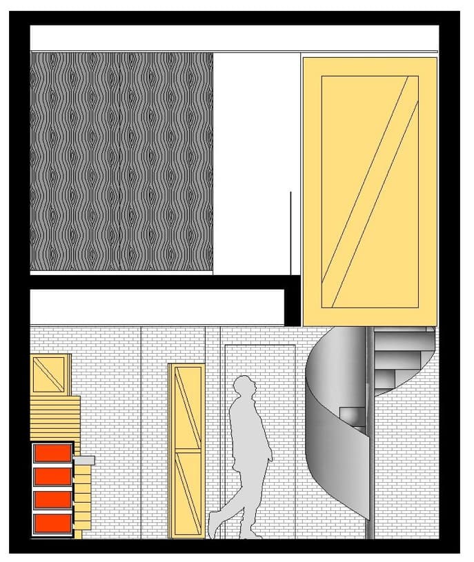 La distribución está realizada en dos plantas. Deja en el piso de entrada un único espacio multifuncional con todos los muebles de almacenaje adosados a una de sus paredes. El dormitorio está situado en el piso superior, al que se accede por una escalera helicoidal metálica. La decoración está marcada por unos muebles que tienen la apariencia de grandes cajas de madera, combinados con otros elementos en color rojo y negro.