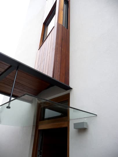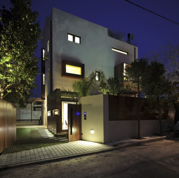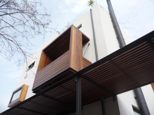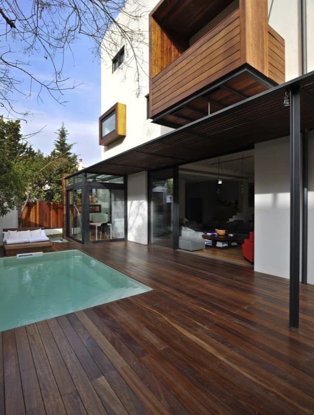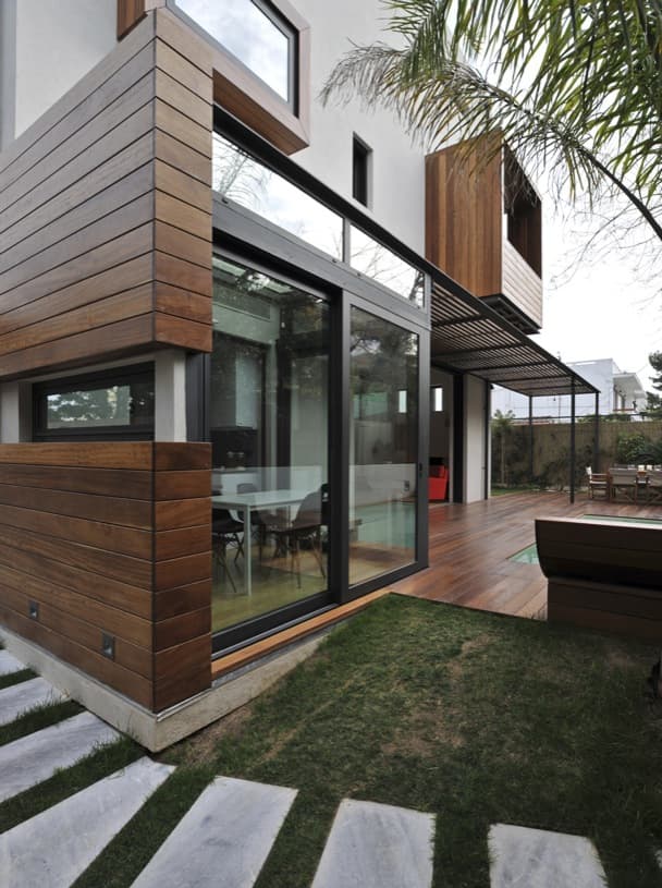 Desde la calle, su fachada destaca por la madera que se ha utilizado para enmarcar las ventanas, y la caja saliente que forma el balcón. Esta disposición crea un fuerte contrasta con el color claro del resto del acabado exterior. También en el pavimento que rodea la piscina, la pérgola, y otros elementos, se ha utilizado la misma textura de madera, creando un conjunto bastante armonioso. Con estos recursos, lo que podía haber sido una caja aburrida, se ha convertido en una moderna casa.