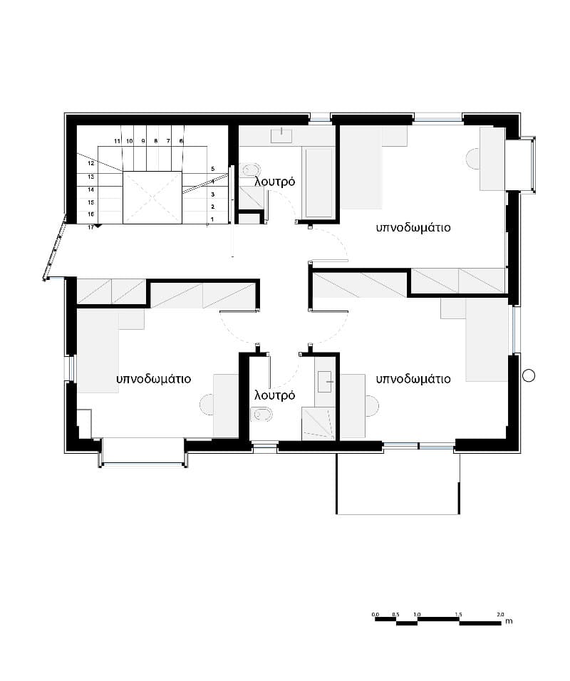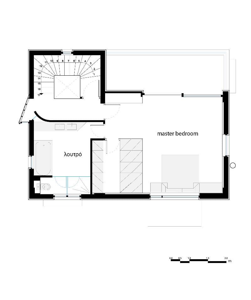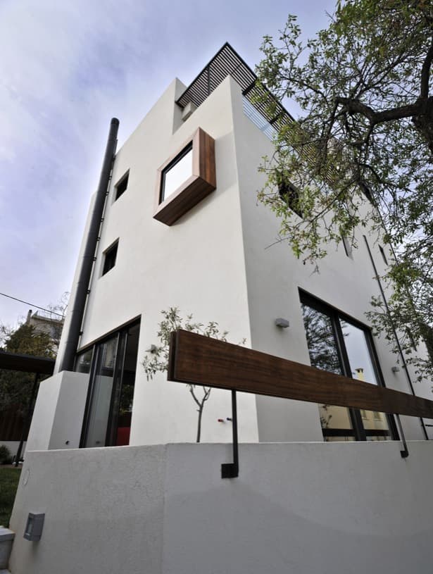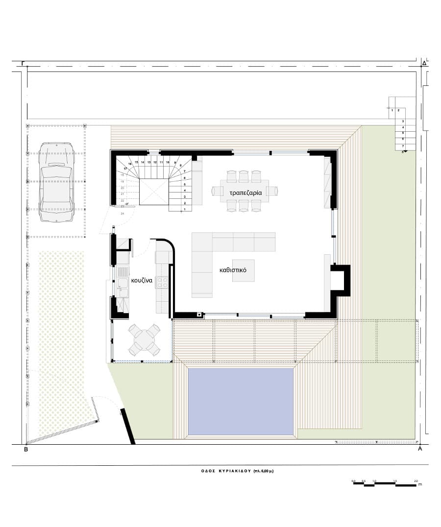 Los autores de este proyecto lo iniciaron cuando se estaba construyendo el edificio con unos muros de ladrillo, en Psychikó, un municipio del área metropolitana de Antenas (Grecia). Se trata de una vivienda para una familia de cinco miembros, desarrollada en vertical, pero con un gran espacio para la zona del salón y el jardín.
