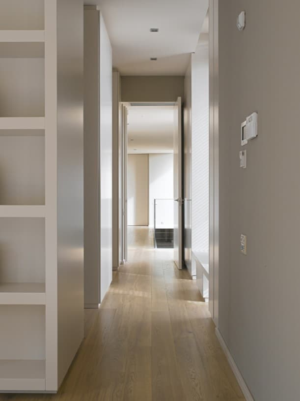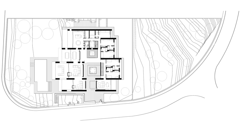 Perpendicular a la dirección de los muros, se ha creado otra secuencia central de patios, garantizando una buena ventilación e iluminación de las estancias. Este esquema divide la casa entre la zona de día, y los dormitorios. Es una lástima que no dispongamos del plano de planta sótano, pero sí hemos encontrado una foto de su interior: también está protagonizado por los muros de piedra, y en algunas zonas se ha llevado la luz natural mediante lucernarios, como bien lo demuestran las dos fotos siguientes.