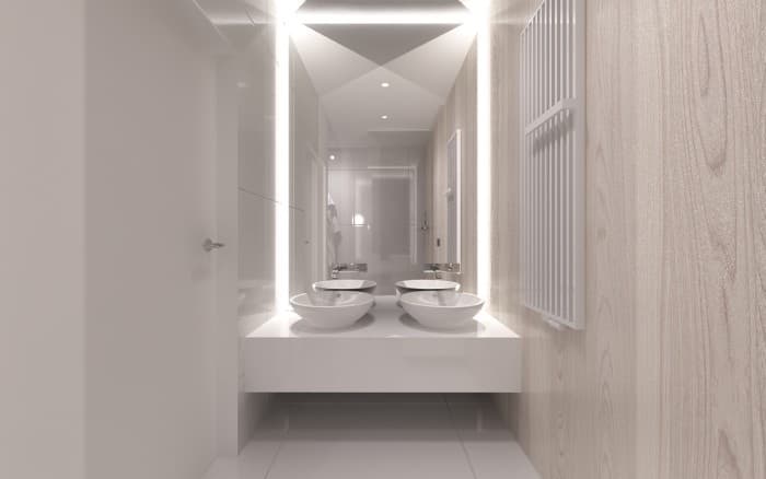 Los renders del proyecto son buenos, porque dan una buena idea al cliente de cómo podrá quedar su casa. Todos están realizados con una simulación de luz artificial, pero también en ellos se puede apreciar una interesante decoración de interiores que combina todos los aspectos requeridos. Los arquitectos buscaron el estilo nórdico con determinados materiales, y una paleta de colores uniforme. Predomina el color blanco, además del gris, negro, y marrón. Para los pisos y paredes de la sala de estar, pasillo, y baño, se ha utilizado la madera como material de revestimiento.
