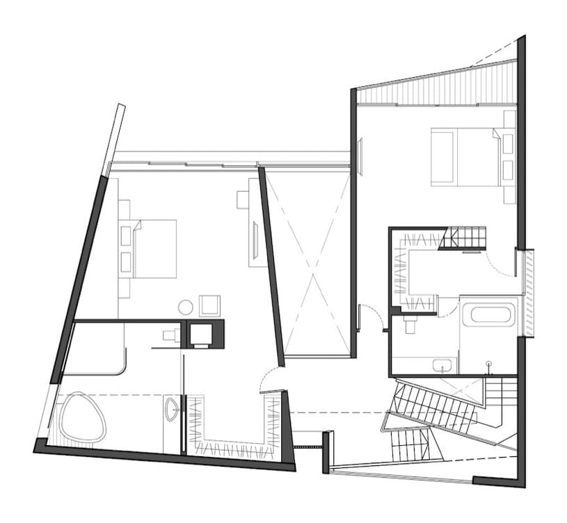 Tanto las fachadas frontales como laterales de esta vivienda, cuentan con huecos estratégicamente situados (el triangular de la escalera principal, es magnífico). La intención fue la de garantizar en todo momento la iluminación natural apropiada para cada estancia. Tampoco se descuidó la privacidad, frente al acoso de las construcciones colindantes. Un detalle que no hay que perder de vista de este proyecto es que al tener muros inclinados en las esquinas, permite que el edificio tenga menor huella en el terreno. Esto también hace que se amplíen los espacios en los pisos superiores.