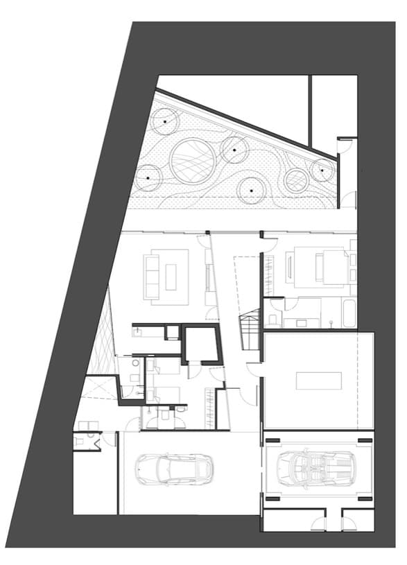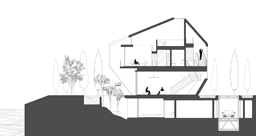 Con el fin de aprovechar mejor el espacio de la parcela, este proyecto no hace uso de una rampa que conduzca al aparcamiento del sótano. En su lugar se ha utilizado un elevador; pero en la parte trasera de la casa sí que se realiza un vaciado. La intención no es otra que la de aportar luz a las habitaciones del sótano. Aquí sorprende ver la piscina situada en el nivel de planta baja. Esta situación es bastante extraña, ya que rompe la típica conexión que suele tener el salón de la vivienda con el jardín-piscina. En su lugar hay un vacío, un hueco, un patio de luces en toda regla. No debemos dejarnos engañar por la siguiente foto, pues el negro de su parte inferior corresponde al vacío del patio (se entiende siguiéndole la pista al tronco del árbol).