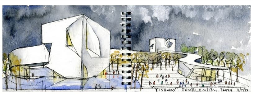 Las instalaciones del Centro de Arte y Cultura de Qingdáo incluyen a cuatro museos diferentes (Arte Moderno, Arte Público, Arte Clásico, y Artes Escénicas), además de un hotel. El módulo que va recorriendo todo el recinto (loop light), tiene una anchura de 20 metros. Permite iluminación lateral a las galerías del nivel inferior, y proporciona espacio suficiente para que se puedan desarrollar dos galerías paralelas. Con esta disposición se evita una circulación sin salida. Además, casi en toda su longitud, deja paso a las bellas zonas verdes proyectadas, en las que se integran diversas láminas de agua. Estamos por tanto ante una arquitectura que tiene una relación muy estrecha y cuidada con el paisaje.