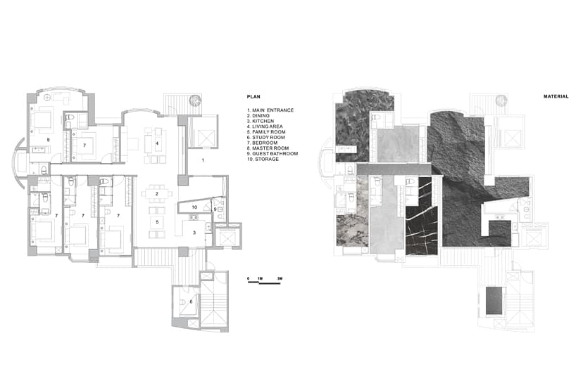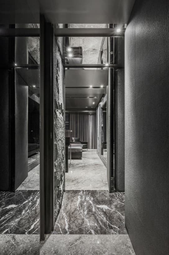 La vivienda está ubicada en un edificio residencial de Taipéi (Taiwán). Tiene una superficie de 265m2, y está organizada según un gran espacio con forma de «L» (sala-comedor-cocina) al que comunica un estrecho y misterioso pasillo que conduce a cinco dormitorios, con puertas que quedan camufladas en la textura de las paredes. El espejo del techo hace que el pasillo se vea aún más estrecho. Cada dormitorio tiene su cuarto de baño propio y espacio para un escritorio. En el dormitorio principal el lavabo está separado del espacio reservado para la ducha-inodoro (foto superior).
