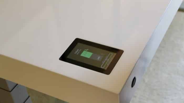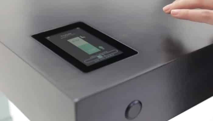 Con este moderno escritorio vamos a poder trabajar en ambas posiciones, ya que incorpora un sistema que automatiza el cambio de altura de su tablero. Pero además servirá para recordarnos a lo largo del día las veces que debemos cambiar de posición. En una de sus esquinas lleva insertada una pequeña tableta, es el ‘cerebro’ de la mesa y sirve también para cambiar de altura. Simplemente con un doble toque en su pantalla, el tablero se muevo.