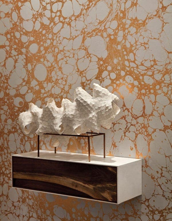 Como se puede comprobar en el vídeo (más abajo), el proceso de fabricación de estos papeles es bastante artesanal. Es un producto de varios años de investigación en diferentes disciplinas de papel marmoleado, especialmente de Japón (suminagashi) y Turquía (ebru), pero que en los papeles de Calico Wallpaper se muestra como algo diferente.