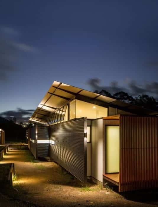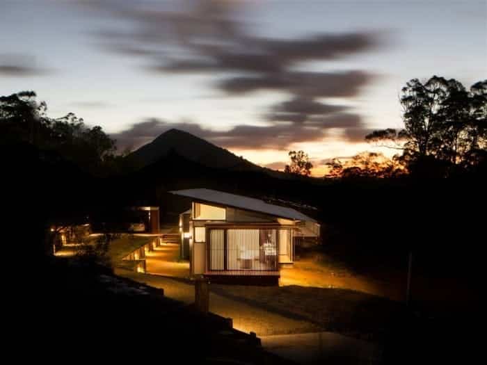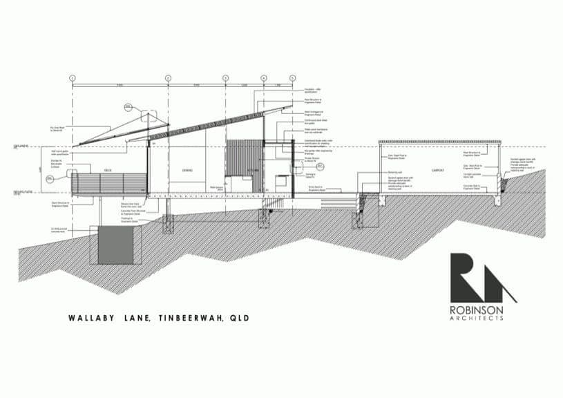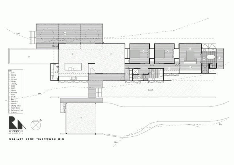 El proyecto Wallaby Lane está construido dentro de una finca alargada de 2 hectáreas, en Sunshine Coast (Queensland, Australia). El propietario necesitaba un edificio para vivir y un estudio, así que el arquitecto decidió ubicar el espacio de trabajo en un extremo de la parcela y dejar el edificio principal en el lado opuesto. Lo hizo siguiendo la topografía del terreno, a modo de vivienda lineal, con un esquema muy claro de su programa, y una interesante aplicación de los materiales.