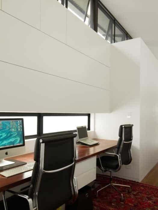A pesar de la proporción tan lineal de la casa, dentro no se percibe como tal. Esto es así porque las distintas funciones vienen a ocupar áreas más o menos cuadradas, algunas de ellas yuxtapuestas. Un ejemplo es la sala y el comedor, que están organizadas con muy buen criterio, y unos tamaños apropiados. Hay tres dormitorios, pero ninguno de ellos tiene un tabique en contacto directo con otro, un detalle en favor de la privacidad.