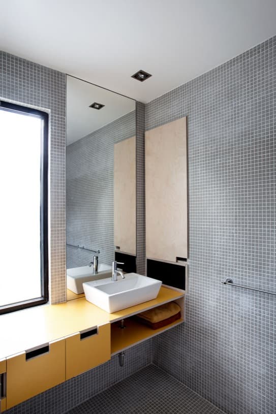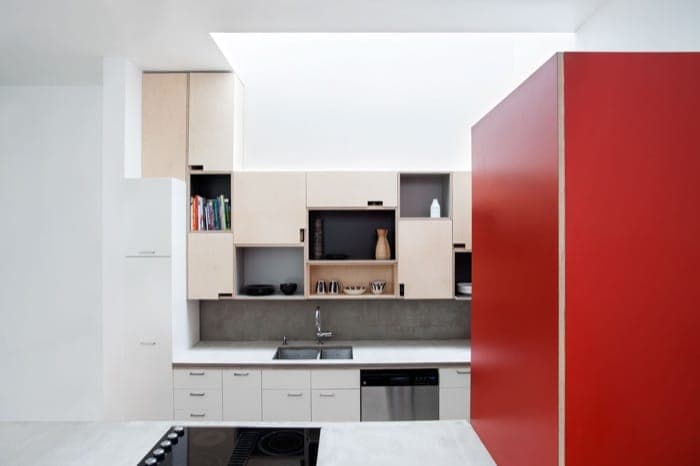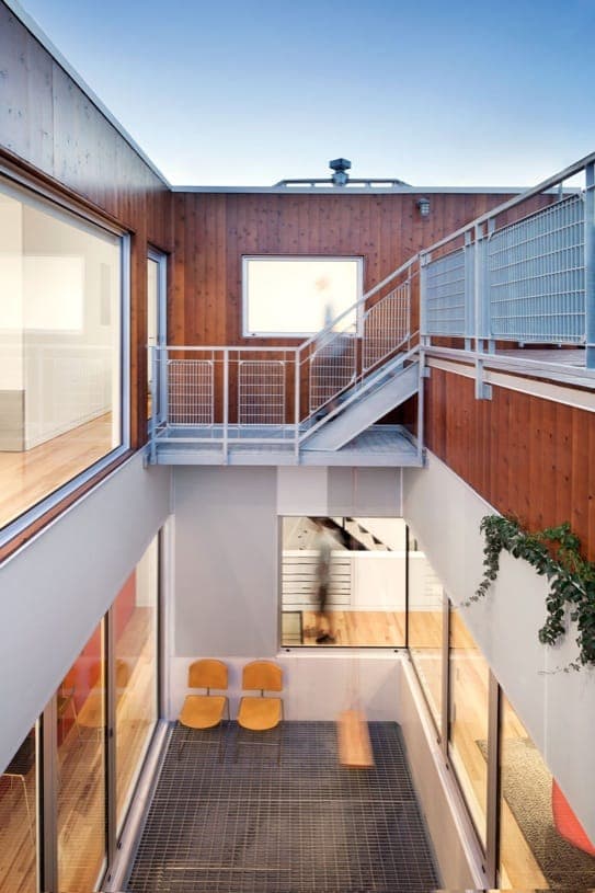 Las habitaciones vivideras se han situado en la tercera planta, poniendo el salón en fachada, y la cocina-comedor al otro lado del patio. Un aspecto interesante de la Casa Stacked es que se ha utilizado un forjado de rejilla metálica en el hueco del patio para garantizar el paso de la luz, al tiempo que permite estar al aire libre en ese nivel. Para iluminar mejor la zona del fregadero, hay un paso de luz cenital justo encima.