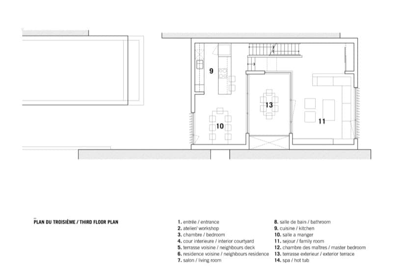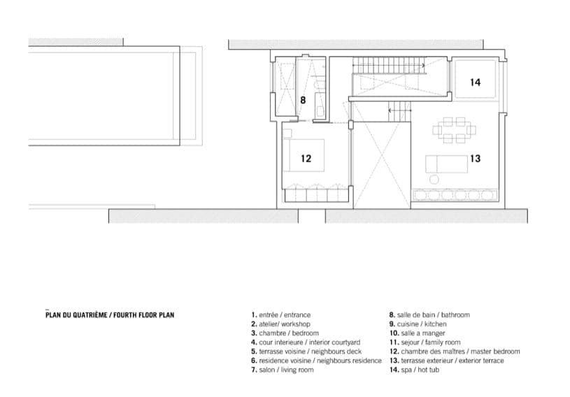 La última planta se ha ocupado con el dormitorio principal, que tiene un cuarto de baño muy peculiar. Tiene un pequeño patio adosado que permite el paso de la luz natural hacia la cocina, y una de sus paredes completamente acristalada. El resto de esta planta está destinado a terraza, e incluye un spa en un rincón.