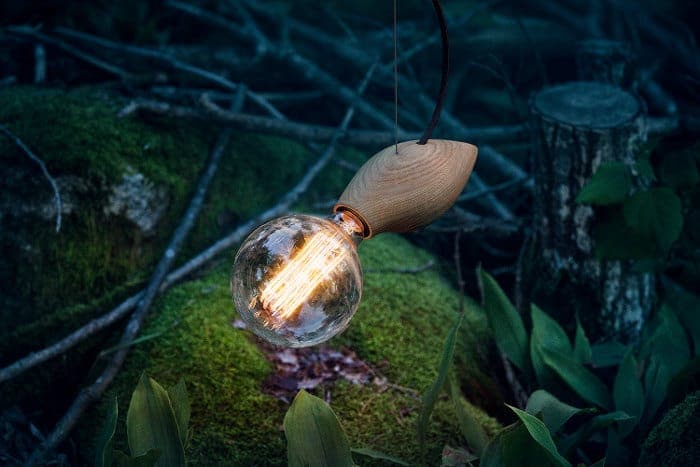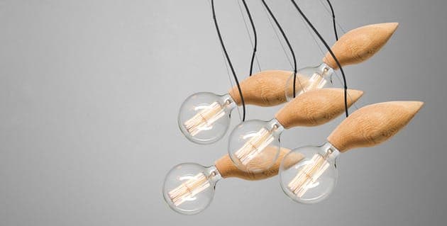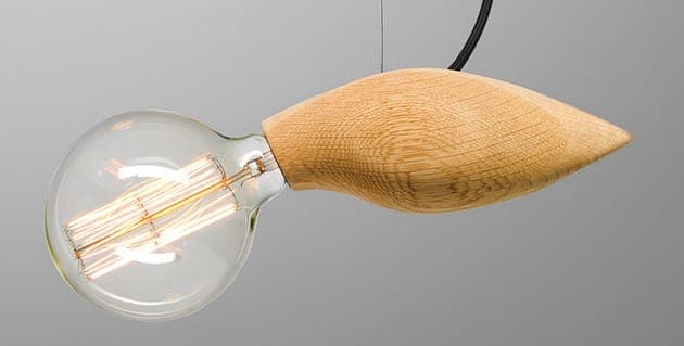 El atractivo efecto que provoca esta lámpara colgante se ve reforzado porque se ha utilizado una bombilla especial Bulbrite. Este modelo muestra un bello juego de filamentos en su interior, produciendo una luz cálida. El cuerpo está hecho con madera, y se cuelga del techo mediante un delgado alambre. Es posible colgarla de diferentes ángulos, ya sea en solitario o en grupo.