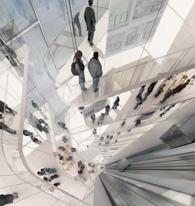 La torre Blue Tape incluye un gran vacío interior. Los despachos del profesorado están adyacentes a los lugares de trabajo en cada uno de los niveles. Vemos varias terrazas públicas, y una amplia rampa de conexión con la estación de metro cercana. Pero tal vez lo mejor de todo sea el diseño del rascacielos en sí. Alterna partes opacas de su fachada con otras más transparentes, y los diferentes cuerpos en voladizo que tiene a lo largo. Lástima que sea solo un trabajo de arquitectura virtual, y que no haya planes para su construcción.