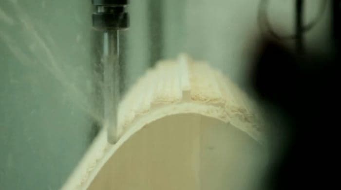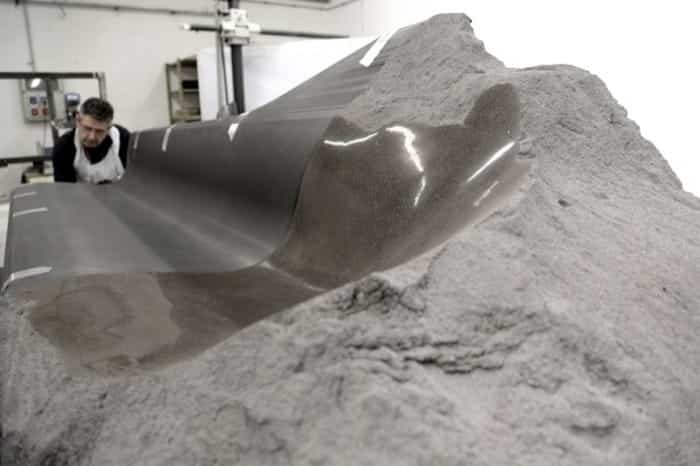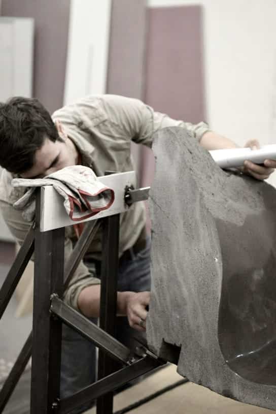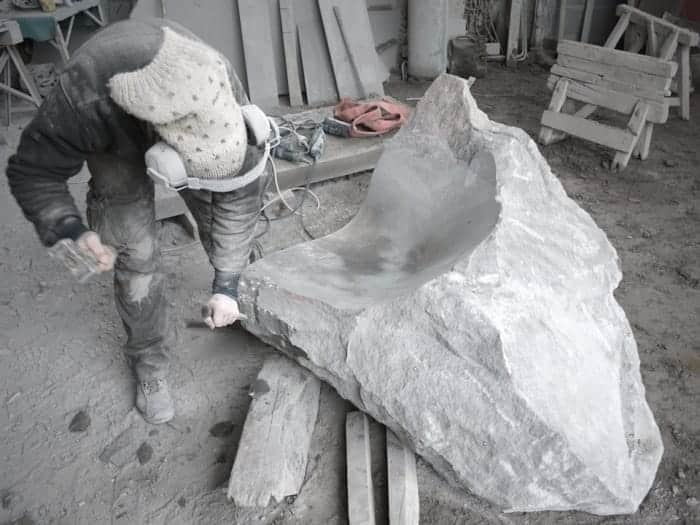 La piedra volvic procede de Auvernia (Francia), donde hay lava de volcanes de hace más de once mil años. Es una roca muy preciada por su resistencia a la congelación y a los productos químicos. El resultado final es un mueble híbrido de cuatrocientos kilos de peso, que tiene una junta recta en la piedra para recoger la unión con la parte de madera.